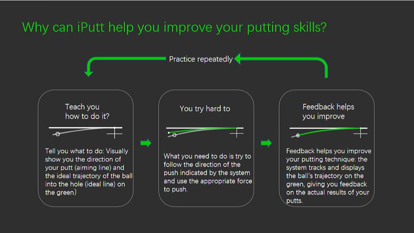 iPutt is an AR golf putting training and entertainment system that innovatively transforms the golf green into an interactive teaching, training, and entertainment environment. Based on the ball's position, green topography, and speed, iPutt provides putting tips: putting direction, calculated putting path, and real-time tracking and display of the ball's trajectory for instant feedback. The repeatability of training and the visualization of correct putting trajectories effectively improve your green reading and putt skills. iPutt also offers a variety of fun interactive games to enhance your putting skills, allowing you to improve your putting technique while having fun.